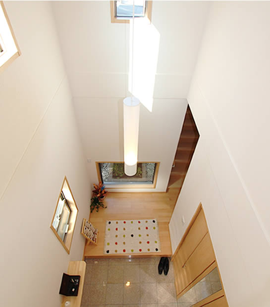 - 玄関ホールには、外部に坪庭が、望めるよう大きなFIX窓を配置しました。坪庭には、スポットライトを埋め込み、夜は、ライトの光で、木々を 照らします。