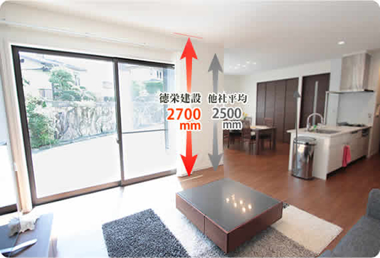天井を高く設定し、お部屋全体の圧迫感を減らすことで明るく開放的な、ゆとりのある空間が広がります。